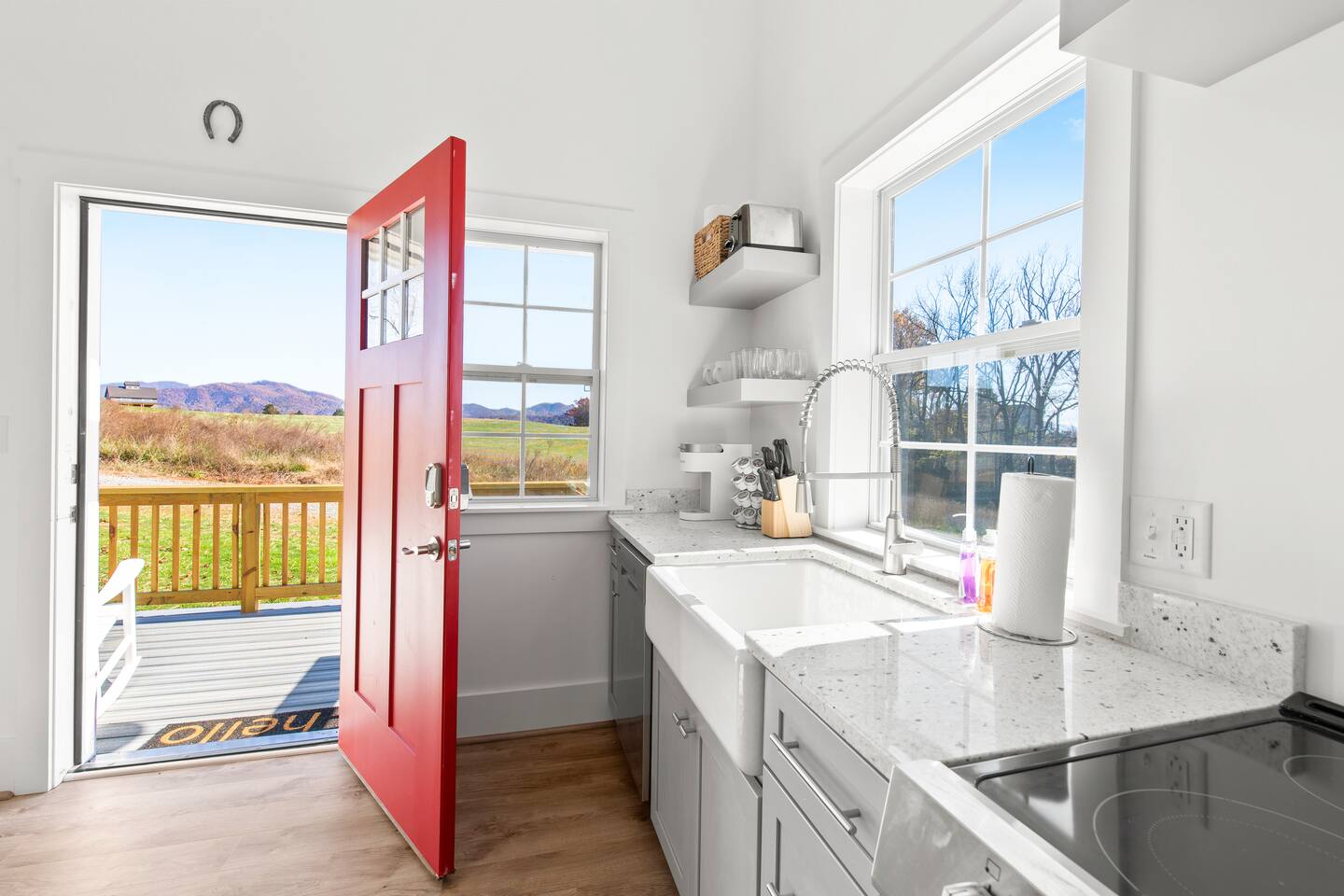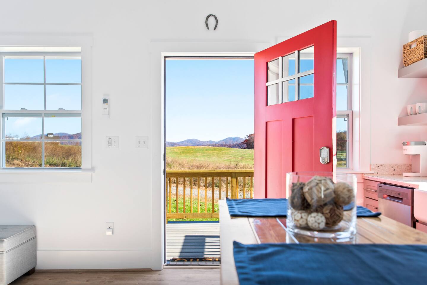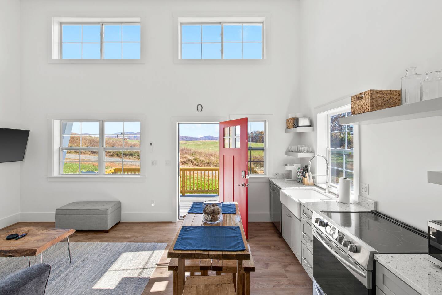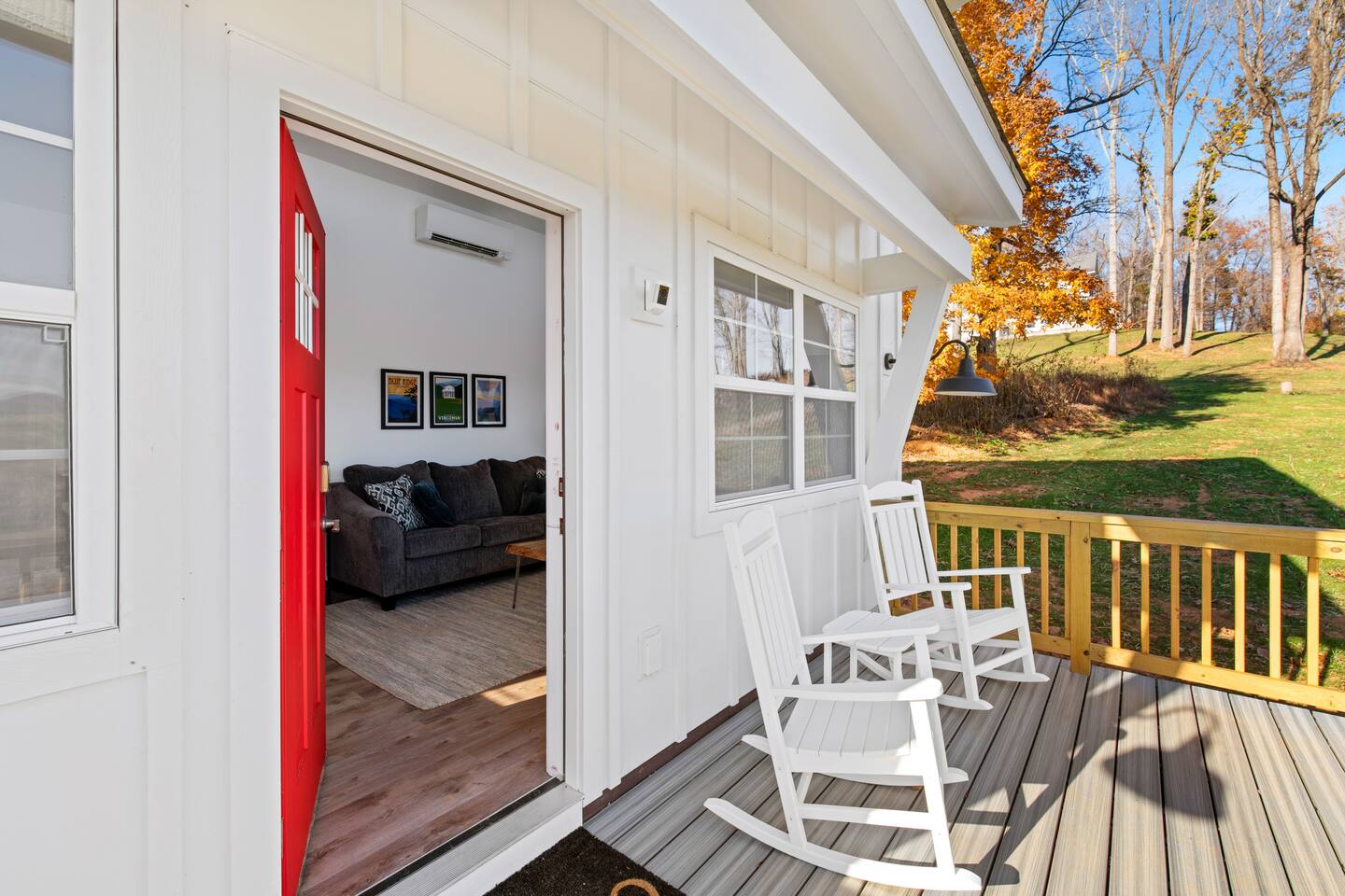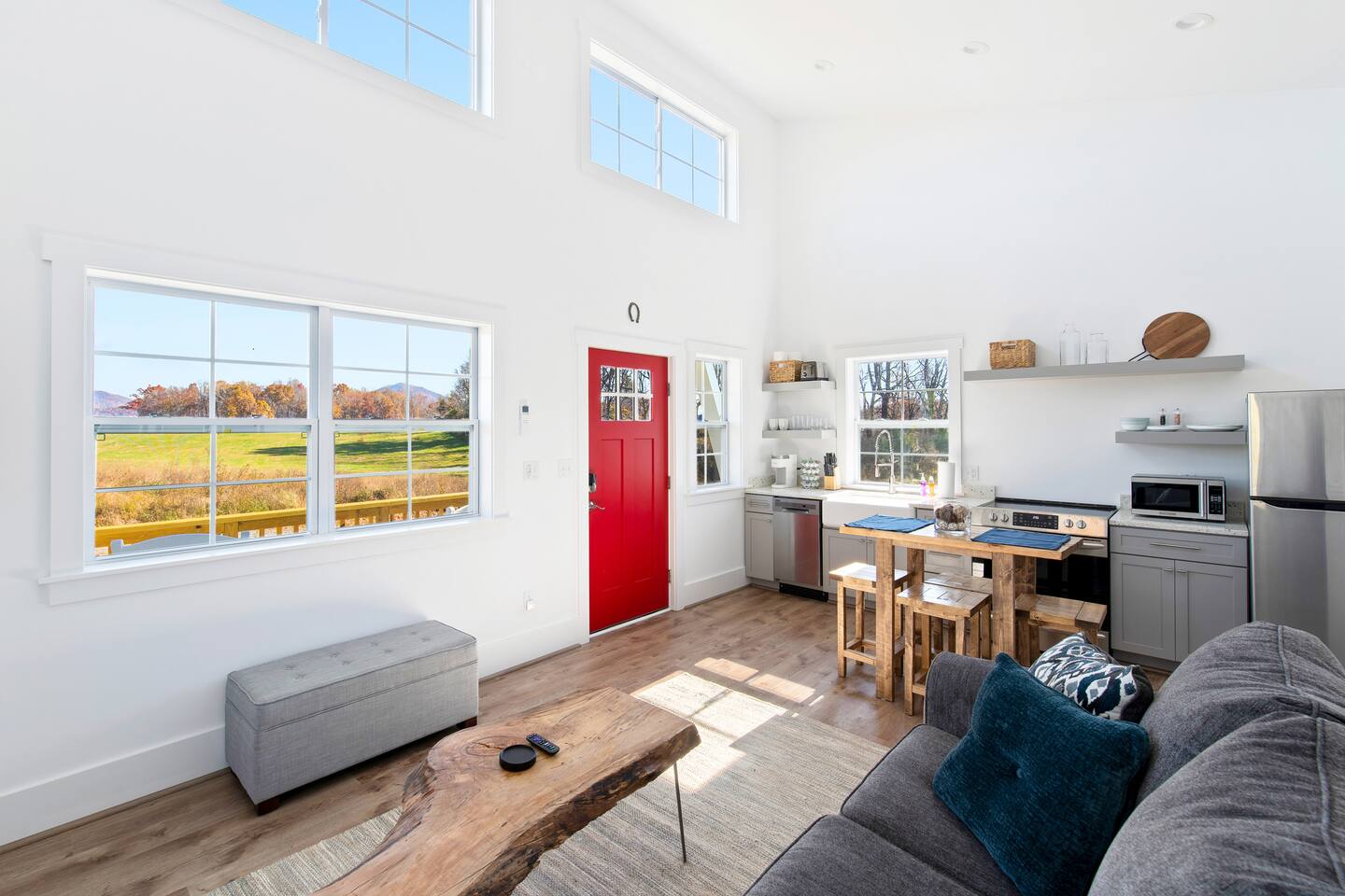 Kick back and relax in this calm and stylish space. Nestled in the heart of the Blue Ridge Mountains and Virginia wine country (just off RTE 151 in Afton), this newly constructed guest cottage is the perfect place for a fun filled getaway. Just minutes away from fantastic hiking, wineries, breweries, and restaurants, this light filled and modern cottage is perfectly framed to take advantage of mountain views from the picture windows. (Please note: all windows have blinds installed, installation was completed after the photos were taken.) Custom designed and completed in October 2022, this cottage located in the heart of Nelson County and the Route 151/Brew Ridge Trail has it all! Mixing modern design elements with a relaxed country farmhouse feel, we hope you'll love the house and property as much as we do. Set on just under 10 acres of open meadows with mountain views, woods, and peace and tranquility. Enjoy coffee or a meal on the front deck/patio with mountain views while the deer come and say hello. Designed with high ceilings, immense windows, picturesque views, and natural light, you may not want to leave! The bedroom consists of a queen size bed, and is separate from the living area and kitchen. The full bathroom contains a combo tub and shower. The living room couch pulls out into a queen size sofa bed. The kitchen is equipped with everything you need to enjoy your own meals. From the electric stove top burners to the granite countertops, stainless steel appliance, and dishwasher, enjoy a luxurious meal in your very own gourmet kitchen. We have pots, pans, utensils, etc. The cottage has its own high speed fiber optic internet connection, allowing for fast and efficient WiFi access. The 50 inch 4K HDR Roku smart TV picks allows you to stream your favorite smart streaming apps using Roku Guest Access, which automatically logs you out when you depart. You will have access to the entire home, it will be your house during the stay. Please note that the main house up the hill may also be occupied during your stay. While you have privacy from one another, you share the same driveway. Things to note: -Our main house is about 100-150 yards up the driveway from the cottage. (See pictures depicting their respective locations.) -The cottage is screened from the main house by trees, and they both can be rented in conjunction with one another if availability allows -While we love animals, no pets allowed -No smoking allowed anywhere on the premises -Absolutely no parties -Children and babies welcome -Quiet hours asked from 10 PM - 8 AM -There is a dishwasher in the kitchen -The house is on a septic system and we ask that you help keep our system operational, no foods or grease down the kitchen sink, etc.