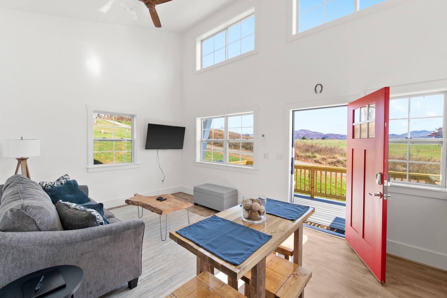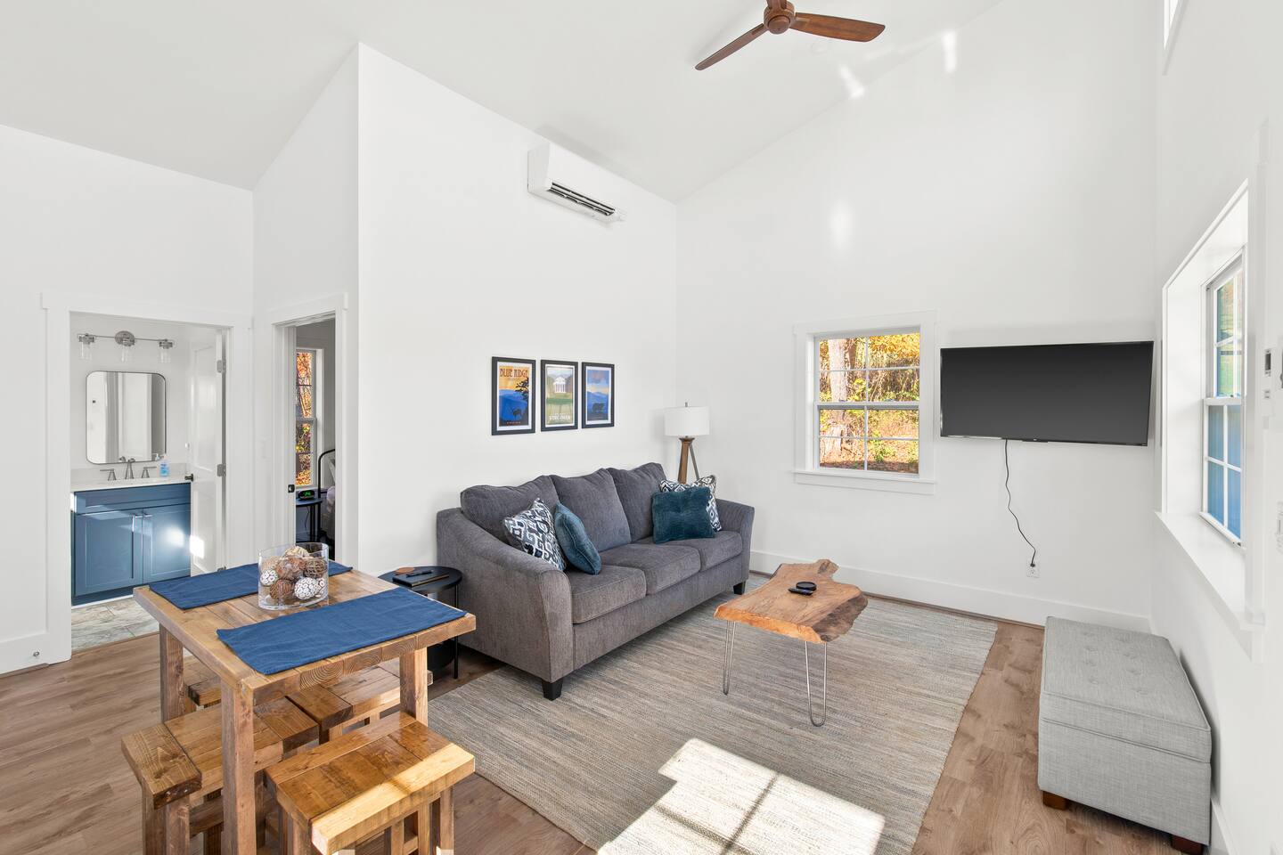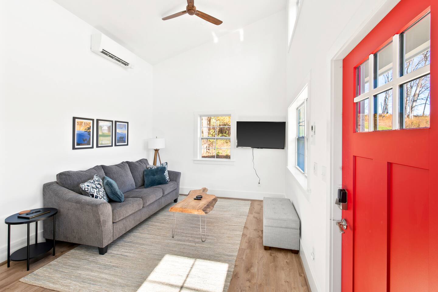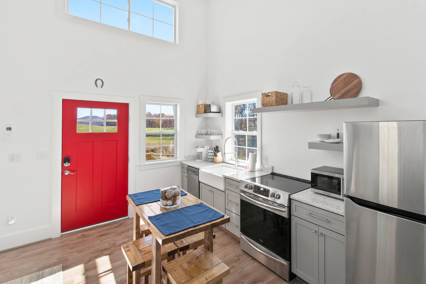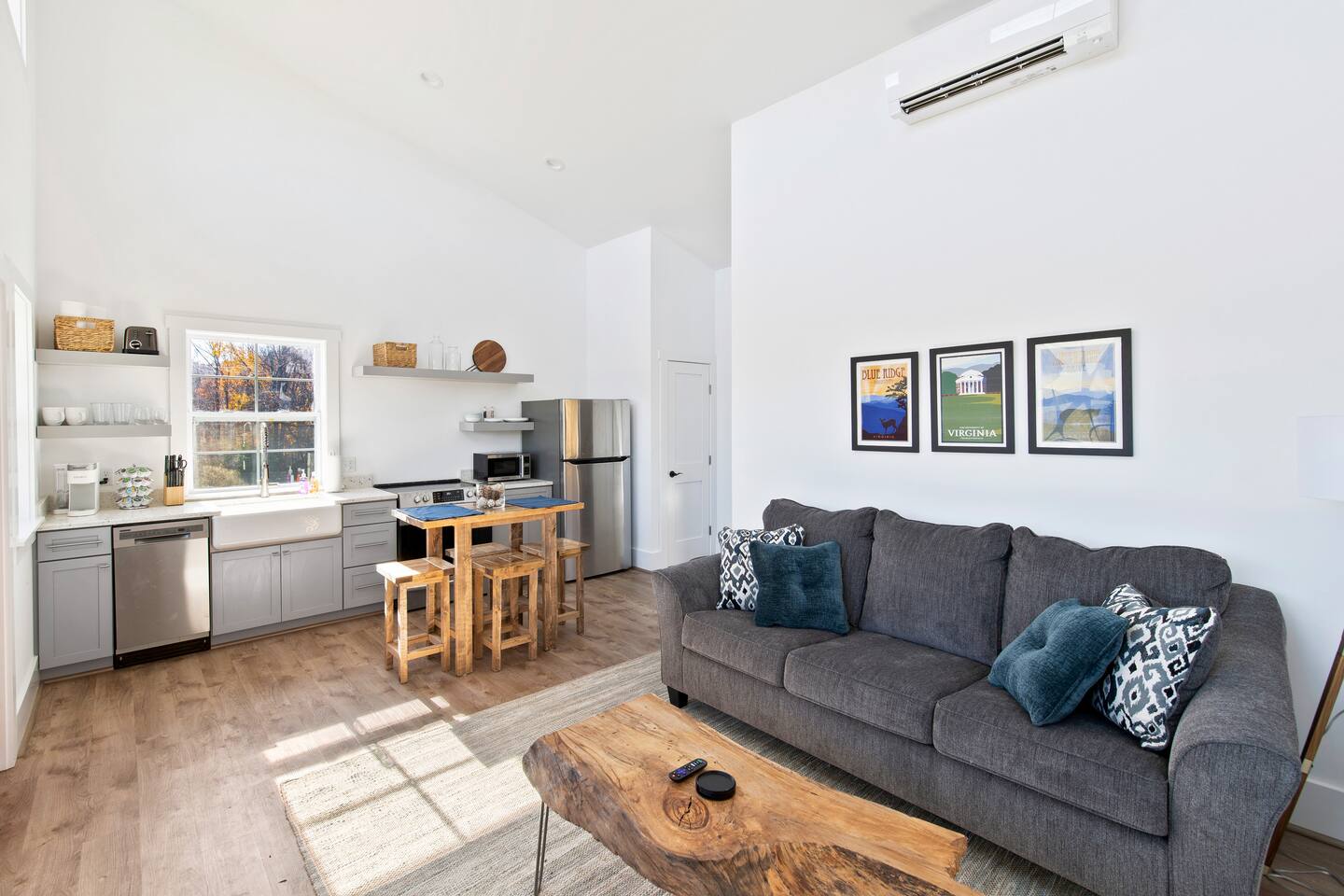 Kick back and relax in this calm and stylish space. Nestled in the heart of the Blue Ridge Mountains and Virginia wine country (just off RTE 151 in Afton), this newly constructed guest cottage is the perfect place for a fun filled getaway. Just minutes away from fantastic hiking, wineries, breweries, and restaurants, this light filled and modern cottage is perfectly framed to take advantage of mountain views from the picture windows. (Please note: all windows have blinds installed, installation was completed after the photos were taken.) Custom designed and completed in October 2022, this cottage located in the heart of Nelson County and the Route 151/Brew Ridge Trail has it all! Mixing modern design elements with a relaxed country farmhouse feel, we hope you'll love the house and property as much as we do. Set on just under 10 acres of open meadows with mountain views, woods, and peace and tranquility. Enjoy coffee or a meal on the front deck/patio with mountain views while the deer come and say hello. Designed with high ceilings, immense windows, picturesque views, and natural light, you may not want to leave! The bedroom consists of a queen size bed, and is separate from the living area and kitchen. The full bathroom contains a combo tub and shower. The living room couch pulls out into a queen size sofa bed. The kitchen is equipped with everything you need to enjoy your own meals. From the electric stove top burners to the granite countertops, stainless steel appliance, and dishwasher, enjoy a luxurious meal in your very own gourmet kitchen. We have pots, pans, utensils, etc. The cottage has its own high speed fiber optic internet connection, allowing for fast and efficient WiFi access. The 50 inch 4K HDR Roku smart TV picks allows you to stream your favorite smart streaming apps using Roku Guest Access, which automatically logs you out when you depart. You will have access to the entire home, it will be your house during the stay. Please note that the main house up the hill may also be occupied during your stay. While you have privacy from one another, you share the same driveway. Things to note: -Our main house is about 100-150 yards up the driveway from the cottage. (See pictures depicting their respective locations.) -The cottage is screened from the main house by trees, and they both can be rented in conjunction with one another if availability allows -While we love animals, no pets allowed -No smoking allowed anywhere on the premises -Absolutely no parties -Children and babies welcome -Quiet hours asked from 10 PM - 8 AM -There is a dishwasher in the kitchen -The house is on a septic system and we ask that you help keep our system operational, no foods or grease down the kitchen sink, etc.